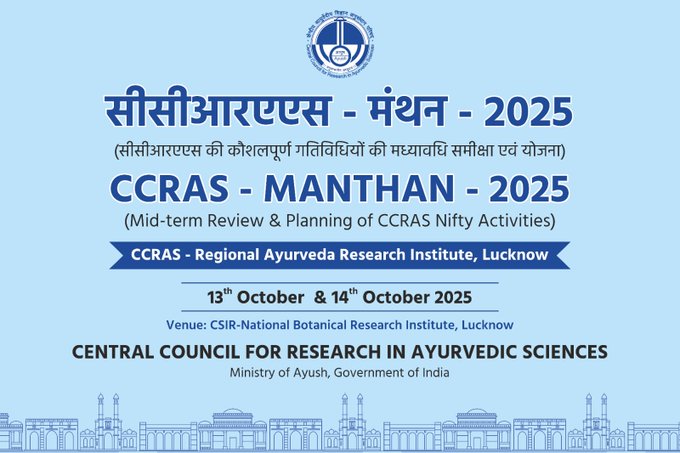 The Central Council for Research in Ayurvedic Sciences (CCRAS), Ministry of Ayush, Government of India, is organizing a two-day planning and review meeting, “CCRAS–Manthan–2025”, from 13th to 14th October 2025 at the Regional Ayurveda Research Institute (RARI), Lucknow.