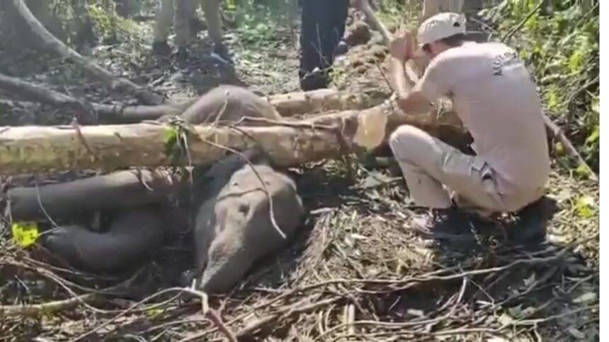 A baby wild elephant was rescued after being trapped under a fallen tree in Manas National Park, Assam. The incident occurred in the Kuklung Range of the Manas National Park. The incident occurred, when a large tree suddenly collapsed, trapping the calf beneath.