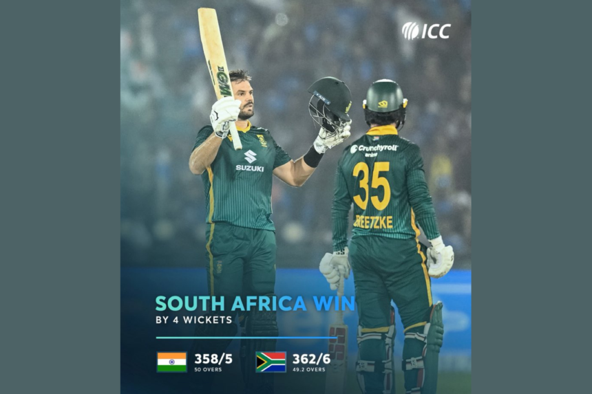 South Africa defeated India by 4 wickets in the second game of the three-match ODI series, at the Shaheed Veer Narayan Singh International Stadium in Raipur last night. Chasing 359 runs to win, South Africa scored 362 for 6 with 4 balls to spare.