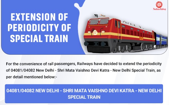 The New Delhi and Shri Mata Vaishno Devi (SMVD) Katra special reserved train services will be extended, announced the Jammu Division of the Northern Railway.The decision taken to meet the growing passengers’ demand.