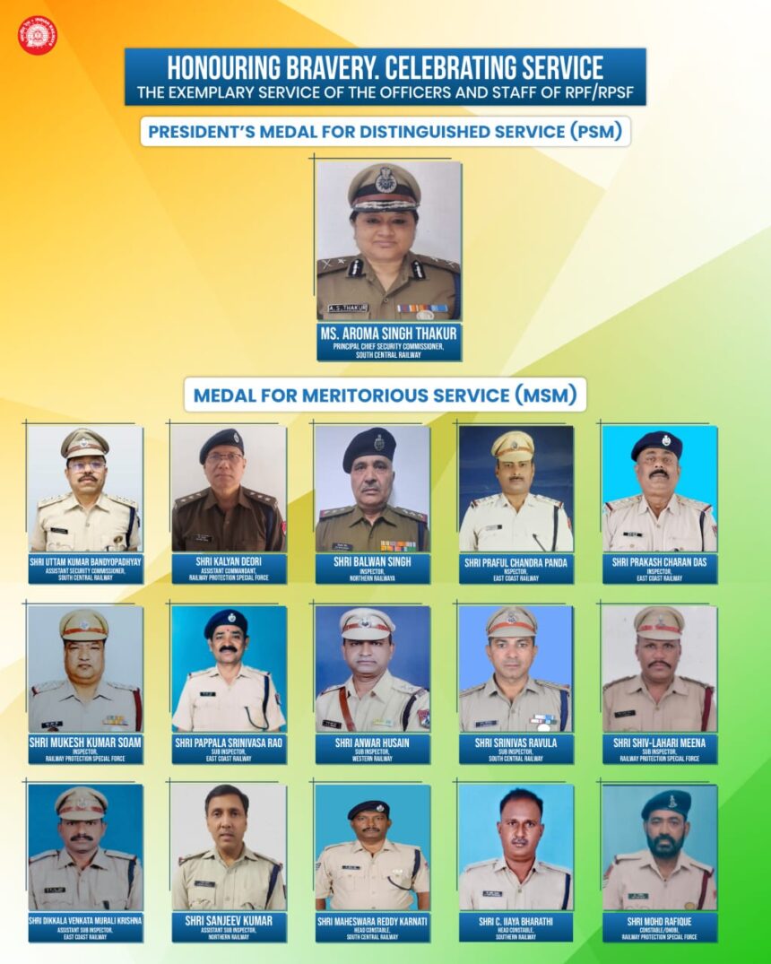 On the occasion of Republic Day 2026, the President of India, Droupadi Murmu has awarded the President’s Medal for Distinguished Service (PSM) and the Medal for Meritorious Service (MSM) to officers and personnel of the Railway Protection Force (RPF) and Railway Protection Special Force (RPSF) in recognition of their dedicated service, professionalism and exemplary contribution to railway security.