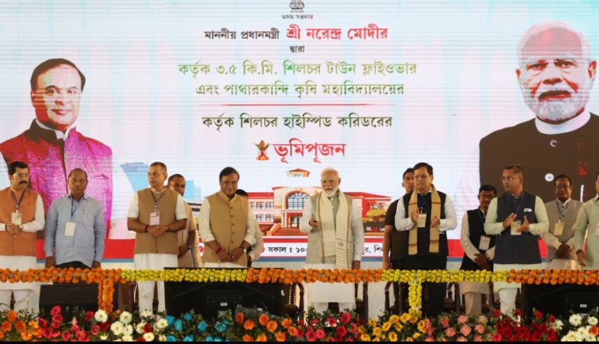 Prime Minister Narendra Modi launched various development projects worth 23,550 crore rupees from Silchar in Assam today. He performed the ‘Bhumi Pujan’ or ground breaking ceremony for three projects at Ambikapur in Silchar. These are, Silchar High-Speed Corridor at a projected cost of 22 thousand 8 hundred and 64 crore rupees, Silchar Town Flyover at a projected cost of approximately 565 crore rupees, and the Patharkandi Agricultural College at a projected cost of one hundred 22 crore rupees.