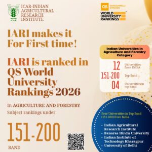 ICAR-Indian Agricultural Research Institute (IARI), has earned a significant global milestone by securing its position in the QS World University Rankings 2026 for the subject area of Agriculture & Forestry. The institute has been placed in the 151-200 band, marking its first-ever appearance in the prestigious global rankings.