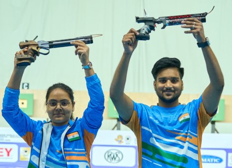 India continued its strong performance at the International Shooting Sport Federation Junior World Cup in Cairo, Egypt, as Vanshika Chaudhary and Chirag Sharma clinched the gold medal in the 10m air pistol mixed team event.